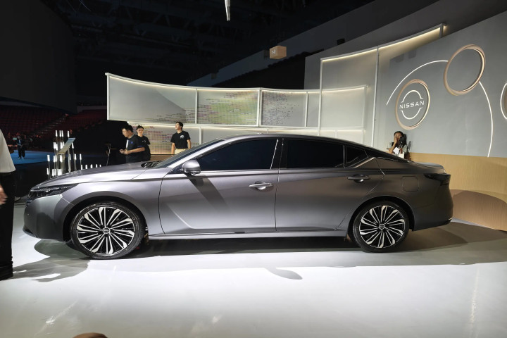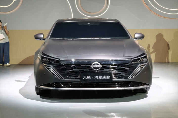 我们首先来看新车的外观设计方面,2026 款天籁采用日产最新 “Timeless Edge” 设计理念,V-Motion 格栅轮廓得以保留,但内部升级为主动式可变进气栅格,可根据发动机工况自动开闭叶片,高速时降低风阻、激烈驾驶时增强散热,燃油经济性提升明显。格栅上方新增贯穿式 LED 灯带,与两侧矩阵式激光大灯无缝衔接,夜间点亮形成犀利光带,彻底告别现款的保守形象。前保险杠线条重新雕琢,两侧进气口尺寸更大且加入风刀元素,运动气息显著增强,同时底部镀铬饰条点缀,兼顾家用精致感。